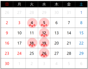 お知らせ 2025.10.28 11月営業日のお知らせ 11月の営業日カレンダーはこちらです。 定休日は、毎週水曜日と、第1、第3火曜日となります。 営業日カレンダーをご確認の上ご来店頂きますようお願い申し上げます。